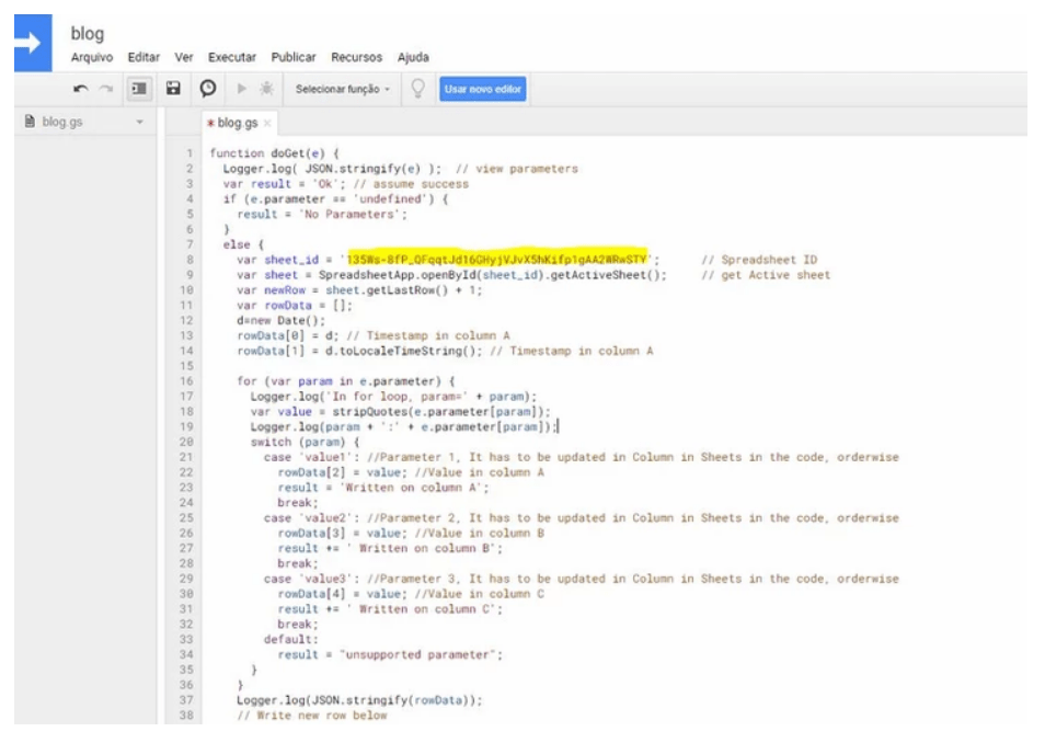 E cole a parte da URL copiada anteriormente no local indicado abaixo, comentado como //Spreadsheet ID: